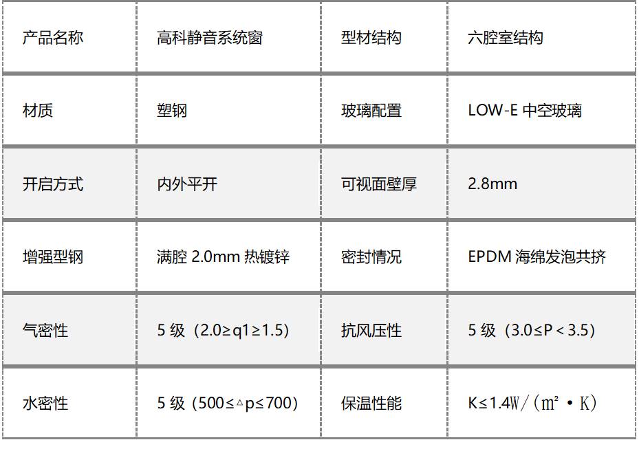 高科靜音系統窗以塑鋼72系列型材為基礎,開扇采用六腔室結構,結構嚴謹并且充分考慮到使用者使用體驗及地區限制,配合高強度五金配件、多鎖點結構設計,保證了整窗性能的同時滿足隔音降噪、高保溫、耐腐蝕、防風防水、裝配便利、節能環保、使用壽命長等多方面功能,保溫性能高達國標9級,充分保證建筑高保溫節能要求,整窗優化設計能夠有效降低聲波的共振,隔絕室外噪音,使室內噪音降低30dB以上。