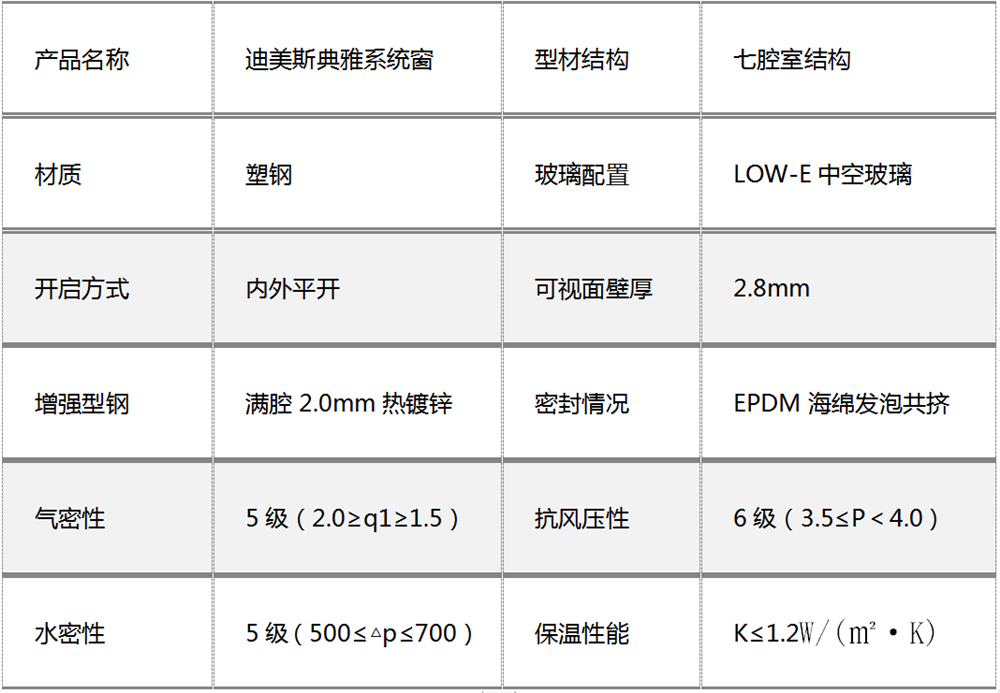 迪美斯典雅系統窗以迪美斯82系列為基礎,產品通過特殊的型材槽口設計,使整窗框扇搭接與玻璃裝配密封性更好,鋼襯腔上層的單獨空腔滿足了更高的保溫性能;帶鵝頭設計的窗扇在方便排水的同時保證了立面輕便美觀。七腔室中空設計,空腔可以有效降低熱傳導,使整窗傳熱系數升級到1.1,節能率達到了80%以上,密封使用三元乙丙橡膠與粘結性強、氣密性高,伸縮強度大且環保的海綿發泡復合,滿足了更高的性能要求。